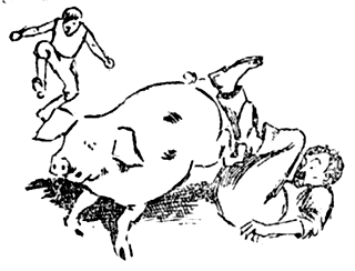 Mais Paul évita l'élan de son ennemi, fit un bond de côté et lui planta la pointe de fer dans le fessier. Ce dernier poussa un cri de douleur et se sauva à toutes jambes. Aussitôt, revirement complet, et les spectateurs de crier: